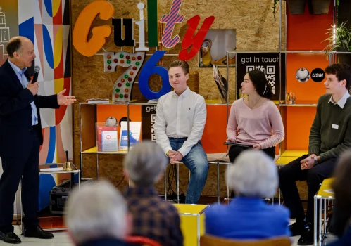Gesprächskonzert am 18.5.2023, dem 175. Jahrestag der Paulskirchenversammlung: Das Elaia Quartetts führte Werke von Dmitri Schostakowitsch, Leoš Janáček und Fanny Hensel auf. Ansgar Kemmann, Mitglied des Vorstands des Bürgervereins, diskutierte in den Aufführungspausen mit Cellistin Karolin Spegg und dem Vorstandssprecher der Jungen Deutschen Philharmonie Joshua Dahlmanns, inwiefern die Arbeit in dem basisdemokratisch organisierten Orchester demokratische Werte und Praxis schult.