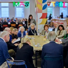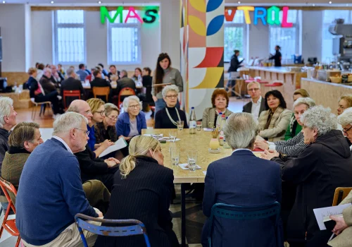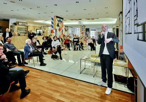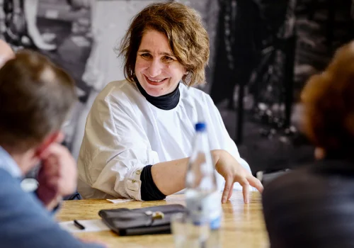 Zur Frage „Wofür braucht die Paulskirche ein Haus der Demokratie?“ referierten und diskutierten im Frankfurter „Massif Central“ Sophie Bauersachs, Schülerin, Bundessiegerin Jugend debattiert 2021, Stephanie Hartung, Mitgründerin und Vorstand von Pulse of Europe e.V., Nikolaus Hirsch, Architekt, Kurator und Publizist, Direktor CIVA Museum Brüssel, Prof. Helmut Kleine-Kraneburg, Gruber + Kleine-Kraneburg Architekten, Carsten Knop, Herausgeber Frankfurter Allgemeine Zeitung, Dr. Stefan Ruppert, Vorstand Personal & Recht, B. Braun Group, Prof. Dr. Mirjam Wenzel, Direktorin Jüdisches Museum Frankfurt, Mitglied der Expertenkommission „Paulskirche und Haus der Demokratie“.